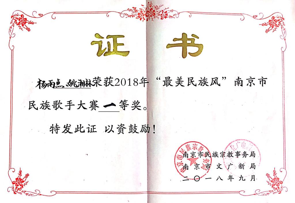 2018年9月29日,我院民俗学专业研究生杨雨点参加了由南京市民族宗教事务局、南京市文广新局主办,南京市栖霞区民宗局、文旅局承办的“最美民族风”南京市民族歌手大赛,大赛于南京市栖霞区文化艺术中心举行。我院学生杨雨点(侗族)与另一名侗族女孩组合成“拉耶组合”登台,以精湛的演唱技巧和热情大方的台风获得评审专家一致好评,从南京市10个区(含江北新区)选送的12名歌手及组合中脱颖而出,喜获一等奖。