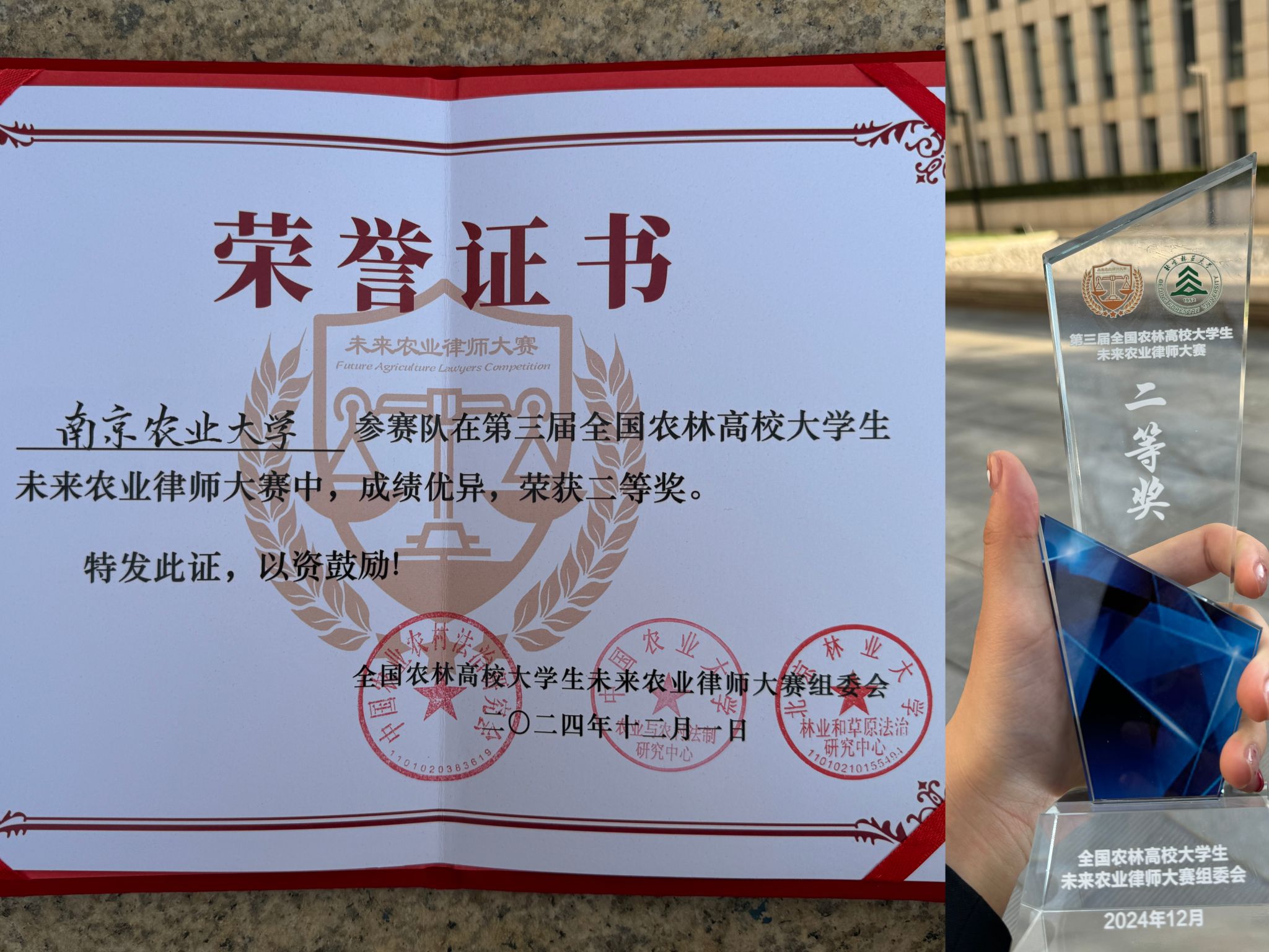 12月1日,第三届全国农林高校大学生未来农业律师大赛在北京落下帷幕,大赛吸引了来自全国22所农林高校的代表队参与其中。我院由张梦婷、吴佳奇、董书源、康钿苓、王卓玥、陈思(研究生)6名本、研学生组成的代表队,在法律系系主任孙永军、专业教师尹雪英带队指导下,最终斩获全国二等奖,并获“最佳文书”荣誉称号。