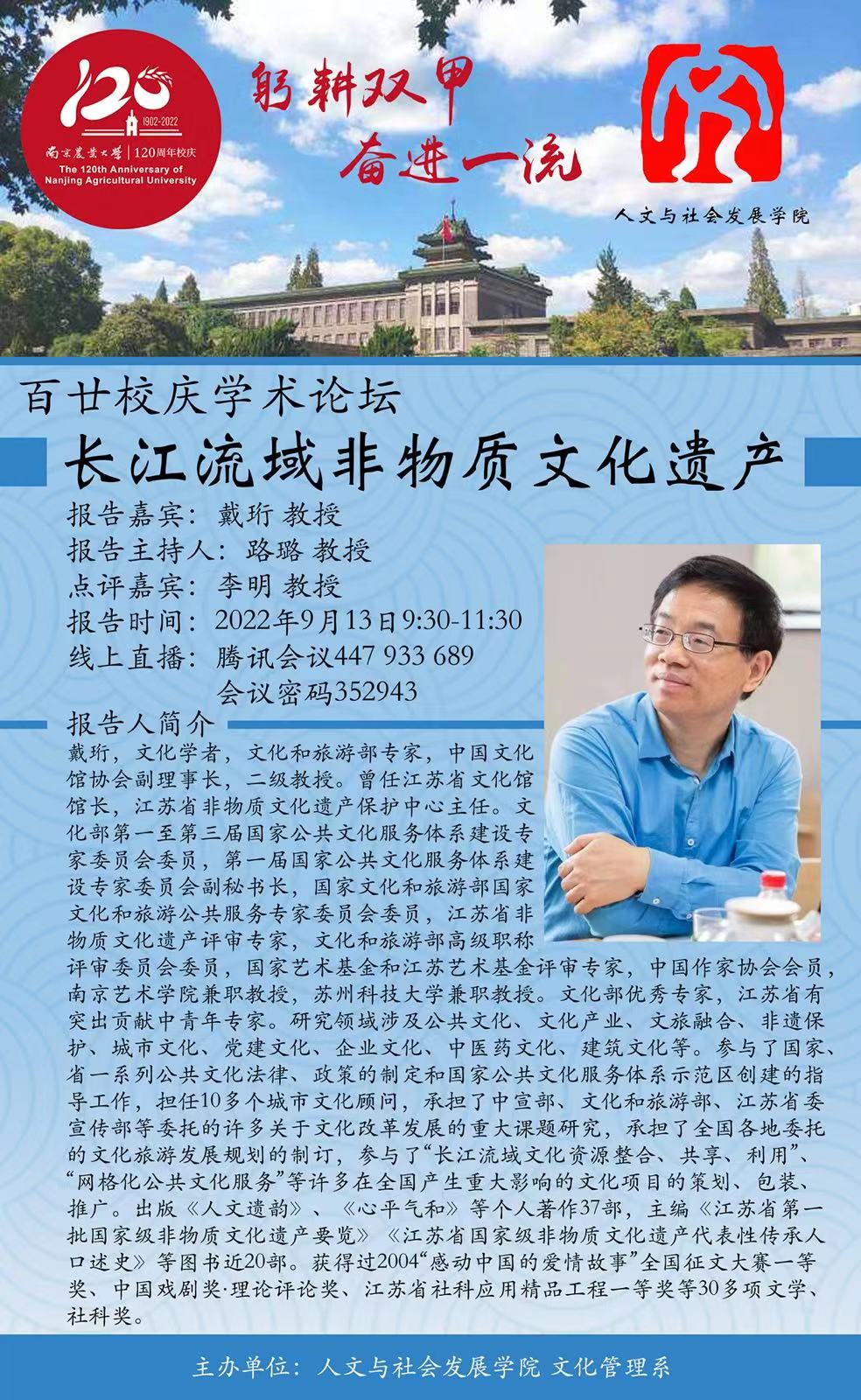 戴珩,文化学者,文化和旅游部专家,中国文化馆协会副理事长,二级教授。曾任江苏省文化馆馆长,江苏省非物质文化遗产保护中心主任。文化部第一至第三届国家公共文化服务体系建设专家委员会委员,第一届国家公共文化服务体系建设专家委员会副秘书长,国家文化和旅游部国家文化和旅游公共服务专家委员会委员,江苏省非物质文化遗产评审专家,文化和旅游部高级职称评审委员会委员,国家艺术基金和江苏艺术基金评审专家,中国作家协会会员,南京艺术学院兼职教授,苏州科技大学兼职教授。文化部优秀专家,江苏省有突出贡献中青年专家。研究领域涉及公共文化、文化产业、文旅融合、非遗保护、城市文化、党建文化、企业文化、中医药文化、建筑文化等。参与了国家、省一系列公共文化法律、政策的制定和国家公共文化服务体系示范区创建的指导工作,担任10多个城市文化顾问,承担了中宣部、文化和旅游部、江苏省委宣传部等委托的许多关于文化改革发展的重大课题研究,承担了全国各地委托的文化旅游发展规划的制订,参与了“长江流域文化资源整合、共享、利用”、“网格化公共文化服务”等许多在全国产生重大影响的文化项目的策划、包装、推广。出版《人文遗韵》、《心平气和》等个人著作37部,主编《江苏省第一批国家级非物质文化遗产要览》《江苏省国家级非物质文化遗产代表性传承人口述史》等图书近20部。获得过2004“感动中国的爱情故事”全国征文大赛一等奖、中国戏剧奖·理论评论奖、江苏省社科应用精品工程一等奖等30多项文学、社科奖。参与指导、撰稿、制作的《一壶春秋》《守望家园》《丝竹雅韵萦江南》等多部电视纪录片在央视、江苏卫视等平台播出。创意、策划、组织、实施了2008北京奥运会江苏“祥云小屋“非物质文化遗产展示、2010上海世博会“江苏周”江苏省非物质文化遗产展示活动、“百年百场”江苏省优秀群众文艺作品巡演、江苏发展大会“江苏乡情文化展”、2022长江文化节“金色之光—2022长江流域非遗金属工艺主题展”等以及数百场省级以上非遗展示、大型文艺晚会、文艺演出、美术展览,并担任总策划、总撰稿。曾参加2011欧亚经济论坛、海峡两岸高层文化论坛等几十场高端论坛和智库峰会,并作主旨演讲。曾应邀在中央文化和旅游管理干部学院、国家图书馆、上海图书馆、南京图书馆、上海交大、南京大学、东南大学、南京师范大学、浙江大学、山东大学、西南大学以及全国各地作过数百场讲座。新华社、人民日报、中国文化报、新华日报、南方日报、中央电视台、江苏电视台、东方电视台等数十家主流媒体作过采访和报道。