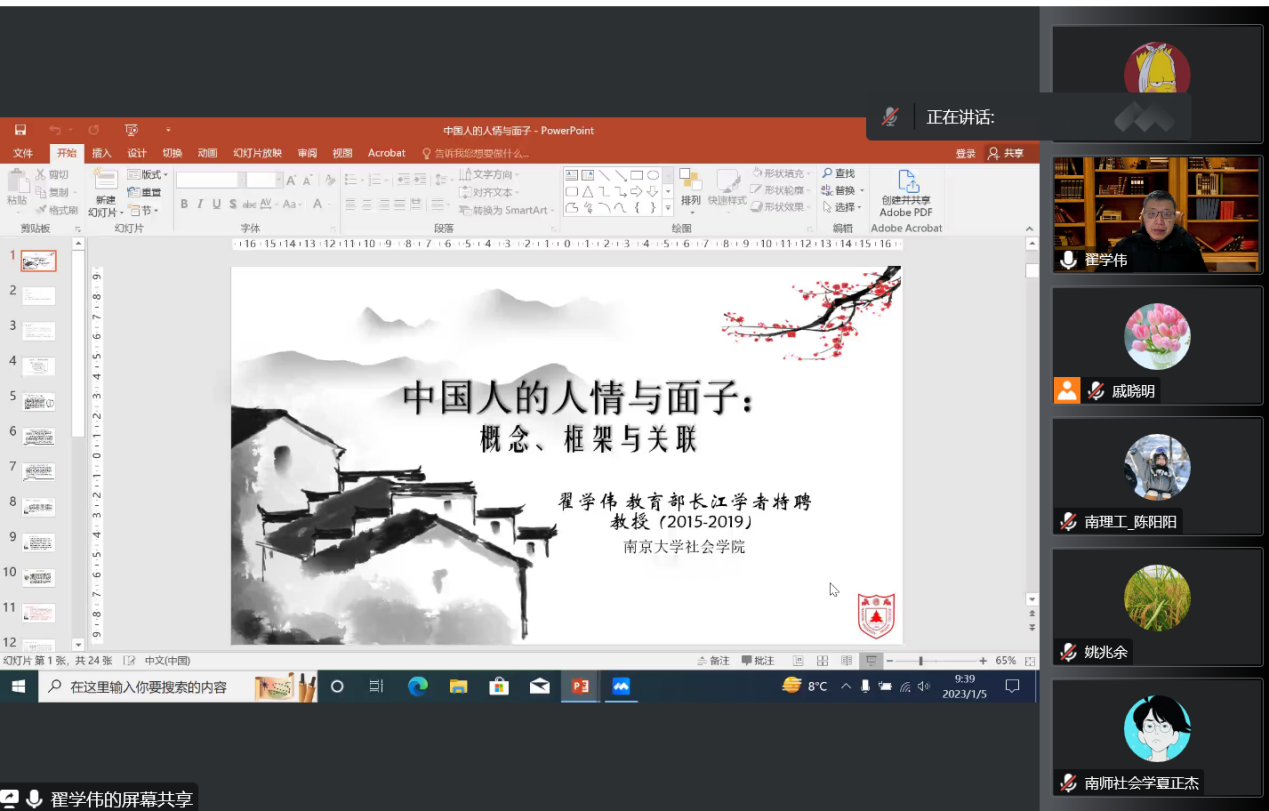 2023年1月5日上午,由437必赢会员中心社会学学科点承办的bwi437官网百廿校庆学术讲座——437必赢会员中心社会学讲坛在腾讯会议举办。南京大学翟学伟教授应邀作了题为“中国人的人情与面子:框架、概念与关联”的学术讲座。本次讲座由437必赢会员中心副院长、社会学学科点点长戚晓明教授主持,社会学系师生、学院其他专业师生及其他高校师生共计两百五十多人参加了本次讲座。