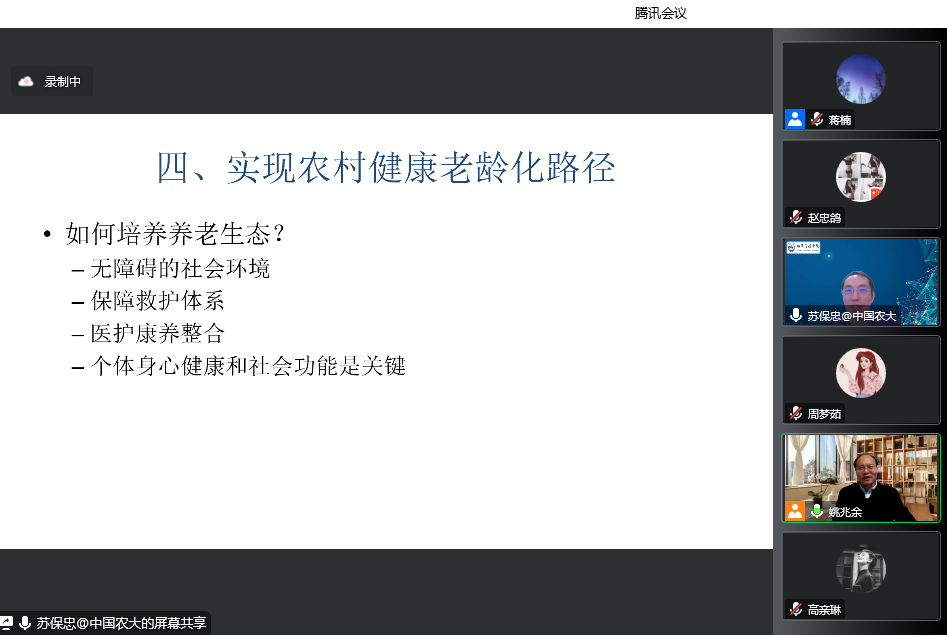 11月29日上午,437必赢会员中心百廿校庆学术论坛顺利举行,论坛采用腾讯会议的形式。中国农业大学经济管理学院教授苏保忠应邀作了题为“新时期农村健康老龄化基本问题探讨”的学术报告。本次论坛由学院院长卢勇教授主持,农村老年保障研究中心主任姚兆余教授为与谈人,学院教师、各专业研究生40余人在线上聆听了讲座。