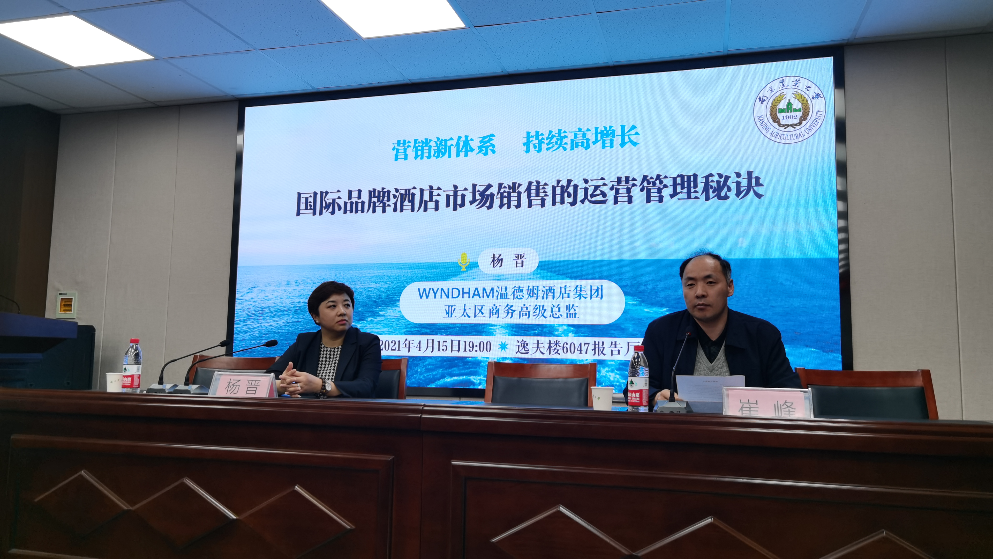 4月15日晚,应我院旅游管理系邀请,温德姆酒店集团(WYNDHAM)亚太区商务高级总监、旅游管理专业2000届优秀校友杨晋女士在逸夫楼6047报告厅作了题为“营销新体系,持续高增长——国际品牌酒店市场销售的运营管理秘诀”的学术讲座。旅游管理系主任崔峰教授、黄颖老师、翁李胜老师及旅游管理等相关专业本科生、研究生共60余人参加了讲座。讲座由崔峰主持。
