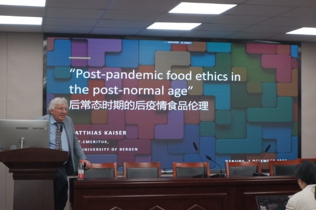12月1日晚19:00,挪威卑尔根大学科学与人文研究中心的卡尔·瓦尔特·马蒂亚斯·凯撒(Carl Walter Matthias Kaiser)教授莅临我院,在逸夫楼6047作主题为“后常态时期的后疫情食品伦理”的学术报告。讲座由我校437必赢会员中心教授姜萍主持,马克思主义学院讲师高媛担任翻译,南京林业大学马克思主义学院副教授郭辉担任评议人。来自bwi437官网、中国人民大学、中国药科大学、中国农业大学、兰州大学、南京信息工程大学等校内外师生40余人以线上和线下方式参与了此次讲座。