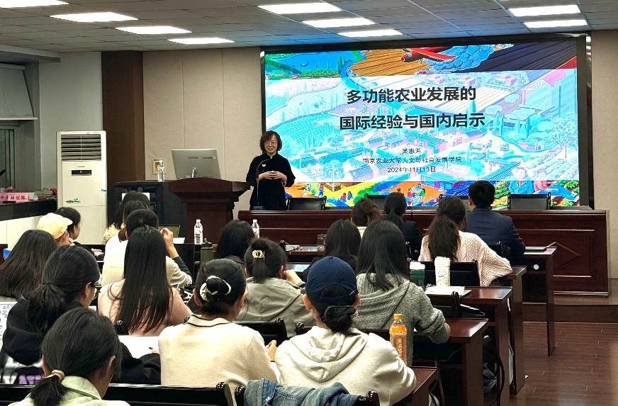 11月13日晚,中国农业大学人文与发展学院副院长、社会学博士生导师吴惠芳教授应邀做客我院学术论坛,围绕“多功能农业发展的国际比较与国内启示”主题做专题学术讲座。我院院长卢勇教授、社会学系党支部书记杨灿君副教授、社会学系主任张兴宇副教授、地标研究中心主任伽红凯副教授、江苏科技大学科学技术史研究所刘海峰副教授及我院近百名学生到场学习。我院副院长戚晓明教授主持本次论坛。