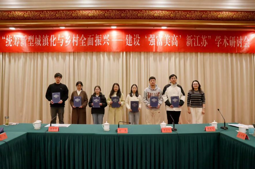 此次研讨会共收到来自各大高校研究生的稿件50余份。经过严格评审,评选出了一、二、三等奖若干名。江苏省社科联常务理事、河海大学原副校长张兵、江苏省城镇化研究会会长邹农俭、江苏省社科联学会部主任鱼雪萍分别为获奖选手颁奖并合影留念。我院2024级社会学研究生刘昕雨同学的“城郊拆迁背景下的居民社会交往研究——从安徽省S村到J社区”和社会工作研究生丁钰宸同学的“‘双轮驱动’视角下的新型城镇化与乡村振兴发展路径及影响机制分析”获三等奖。
