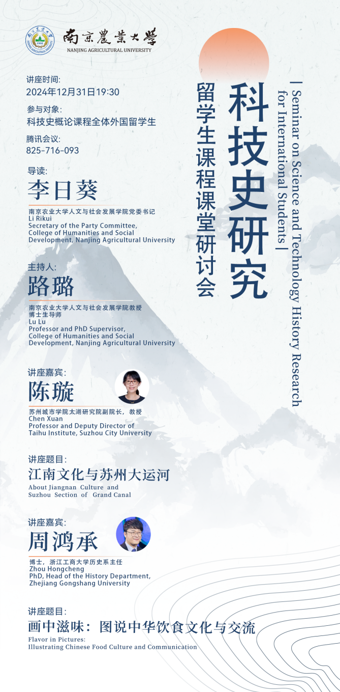 近日,我院科技史研究课程的“留学生课程课堂研讨会”顺利举行。本次研讨会旨在为留学生提供深入了解中国科技史和传统文化的平台。苏州城市学院太湖研究院副院长陈璇教授、浙江工商大学历史系主任周鸿承教授应邀作了学术讲座。研讨会由我院党委书记李日葵导读,专业教师路璐教授主持,科技史研究课程全体留学生及科学技术史硕、博士研究生等60余人参与。