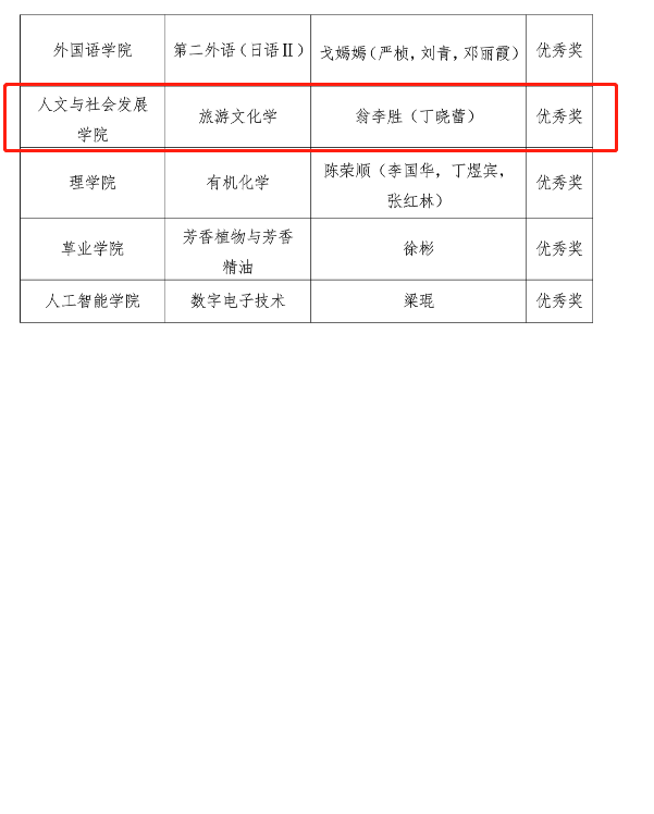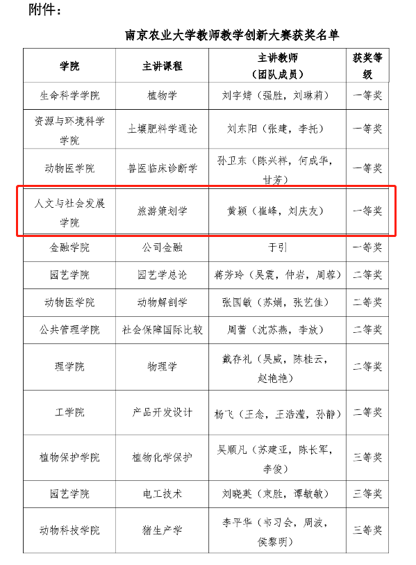 根据《关于举办2022年bwi437官网教师教学创新大赛的通知》(教展〔2022〕137号)精神,经学院选拔、学校初赛与决赛评审,我院黄颖、崔峰、刘庆友团队主讲的“旅游策划学”,翁李胜、丁晓蕾团队主讲的“旅游文化学”,分别获得学校教师教学创新大赛一等奖和优秀奖。
