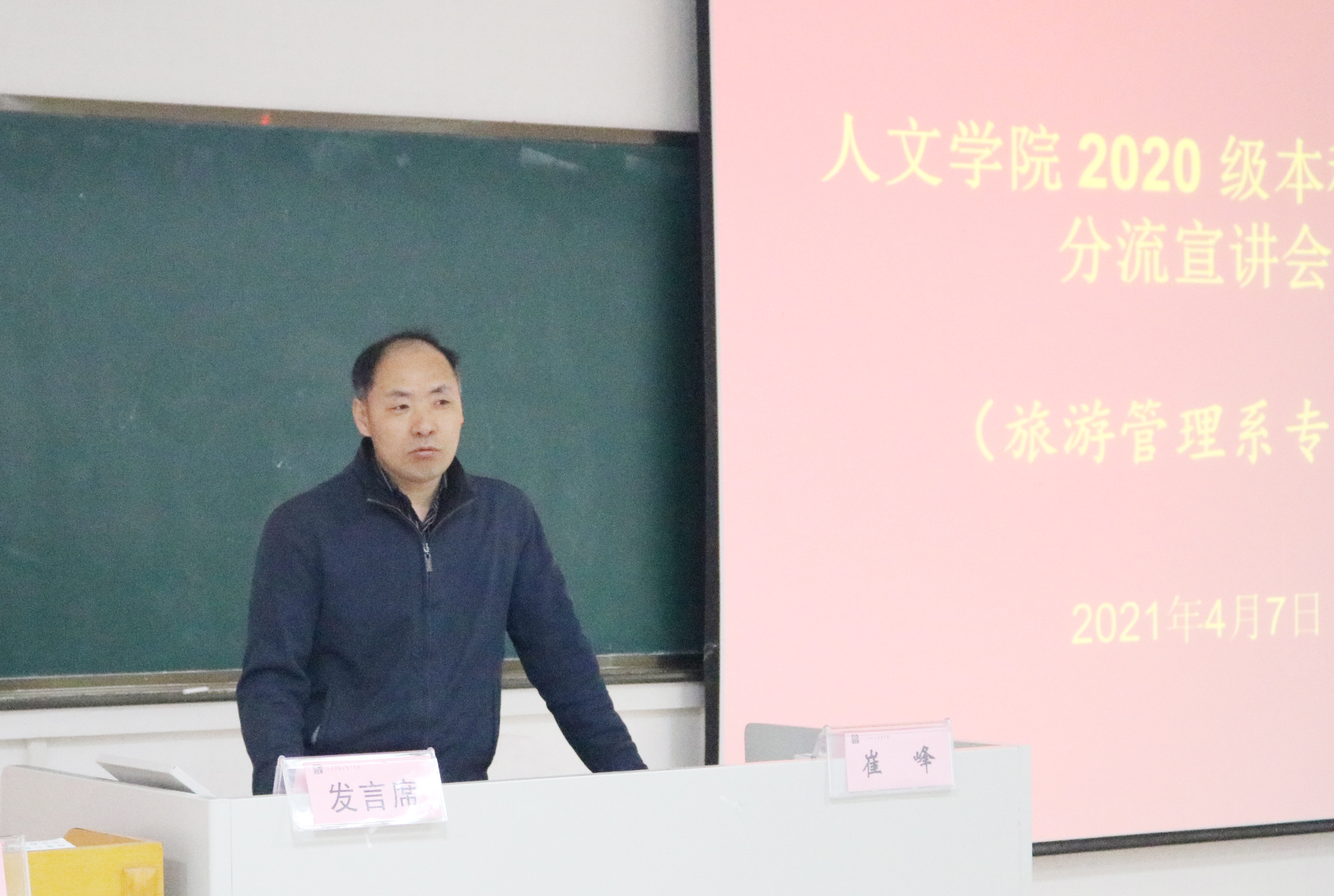 宣讲会第一个环节,由崔峰介绍旅游管理专业及旅游管理系情况。他从旅游管理专业的学科归属、研究对象、研究内容、专业属性和行业特点等方面,就旅游管理专业的总体情况作了简要介绍;重点围绕我院旅游管理系本科人才培养目标与定位、课程设置、师资力量、办学平台与资源、升学就业空间、人才培养质量等,向同学们全方位展示了旅游管理系的办学水平、办学特色及取得的成绩。他寄语在场学生:旅游管理专业强大的综合性、应用性和包容性,可以为有志在旅游这项富有激情和魅力的事业中有所建树的同学们提供广阔的舞台和无限的可能,欢迎大家加入旅游管理专业大家庭!
