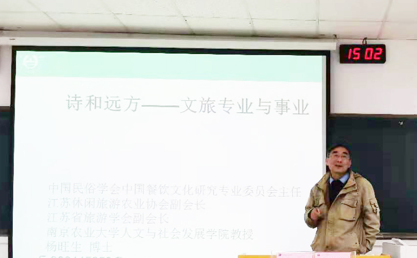 4月7日下午,旅游管理专业宣讲会在教学楼C301顺利举行。旅游管理系主任崔峰教授、系党支部书记尹燕副教授、刘庆友副教授、伽红凯副教授以及黄颖、院玲玲、殷志华、翁李胜、高海连等老师参加了宣讲会,中国民俗学会中国餐饮文化研究专业委员会主任、江苏观光休闲农业协会副会长、江苏省旅游学会副会长、我院杨旺生教授作为特邀嘉宾与会宣讲,旅游管理系2017级本科生、保送华东政法大学研究生徐鑫玉同学作为学生代表参与宣讲会交流活动。宣讲会由尹燕主持。