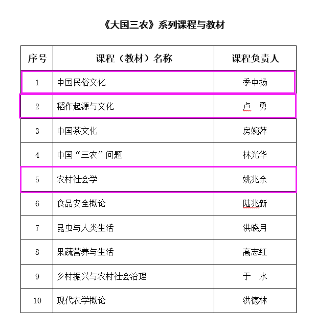 为认真贯彻教育部、农业农村部、国家林业和草原局2018年9月联合下发的《加强农科教建设,实施卓越农林人才教育培养计划2.0的意见》,进一步拓宽农林高校学生的视野,增进学生了解国情和农情,培育学生的“爱农知农为农”素养,增强学生服务“三农”和农业农村现代化的使命感和责任感,经学校研究决定,开展“大国三农”系列课程和教材立项建设工作。全校共有10门课程和教材获准立项,其中我院季中扬教授主持的《中国民俗文化》、卢勇教授主持的《稻作起源与文化》、姚兆余教授主持的《农村社会学》获得立项。(胡必强供稿)