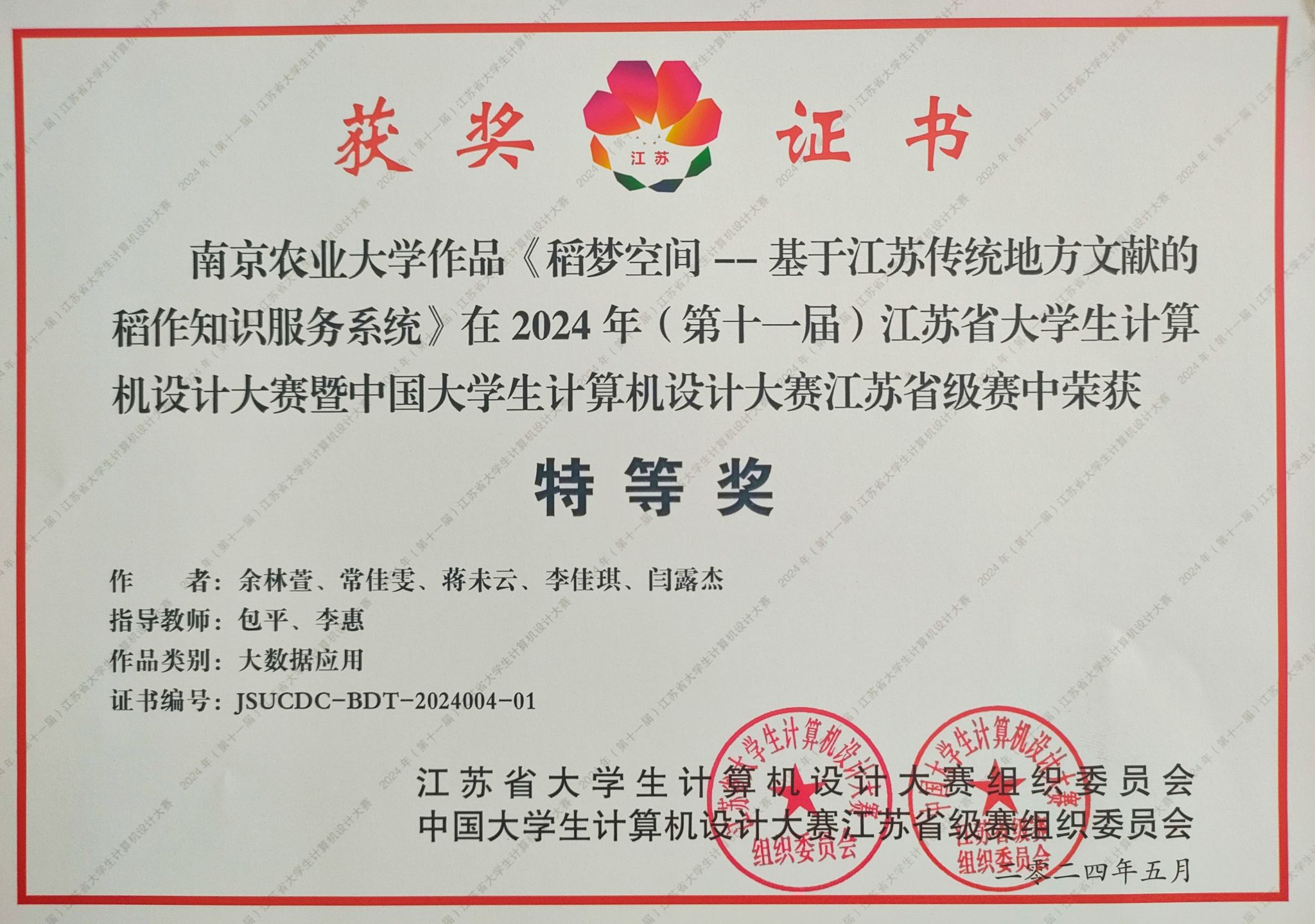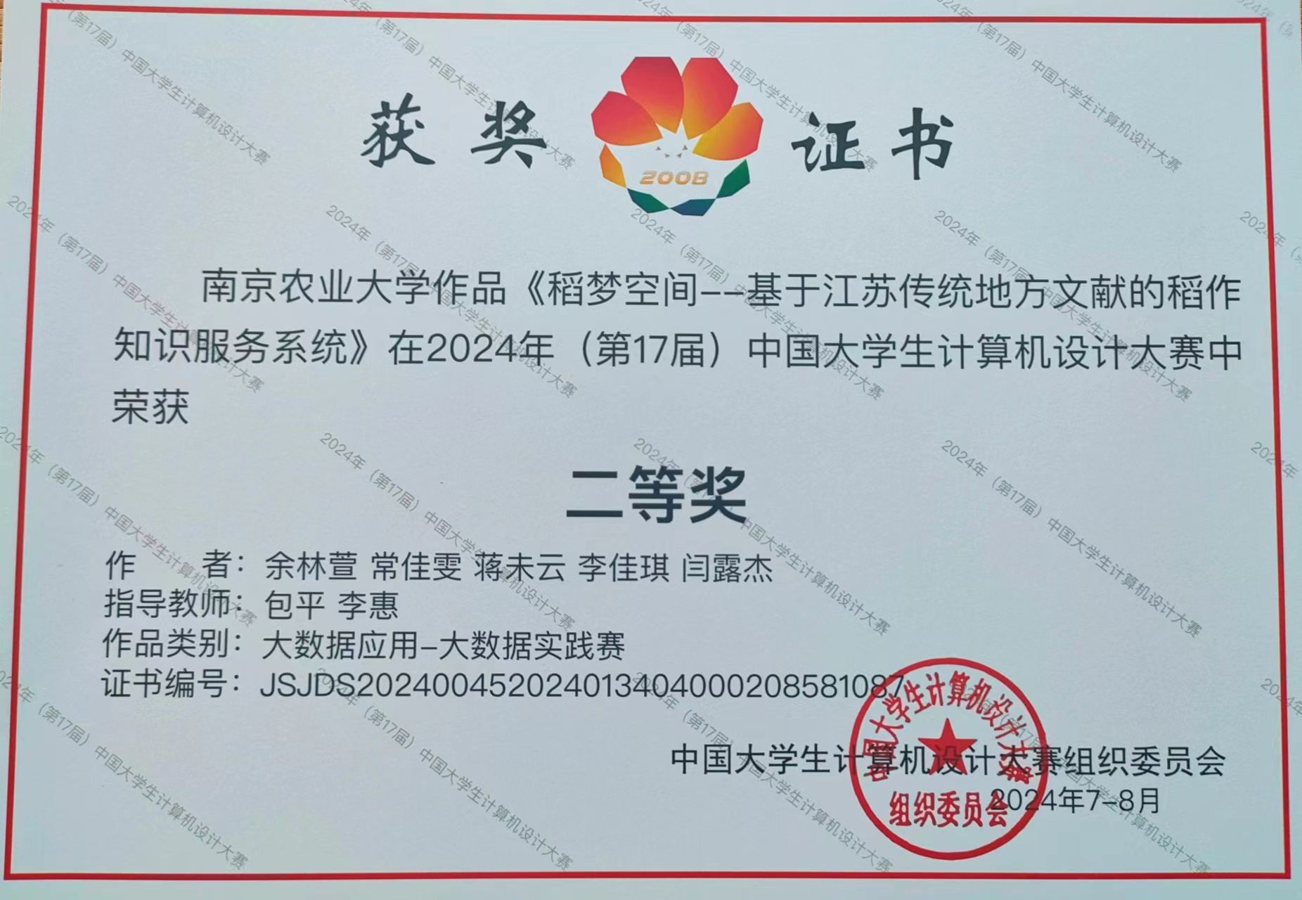 7月20日,2024年(第17届)中国大学生计算机设计大赛“大数据应用、数媒游戏与交互设计”赛道决赛,在上海对外经贸大学松江校区圆满落幕。本次比赛汇聚了全国32个省份290余所高校的459组作品,经现场答辩与专家评审,本校437必赢会员中心选送作品《稻梦空间——基于江苏传统地方文献的稻作知识服务系统》从全国优秀学子的激烈角逐中脱颖而出,荣获全国决赛二等奖及江苏省省赛特等奖,指导教师包平、李惠获得“优秀指导教师”称号,这是我校在该赛道中首次获得此殊荣。